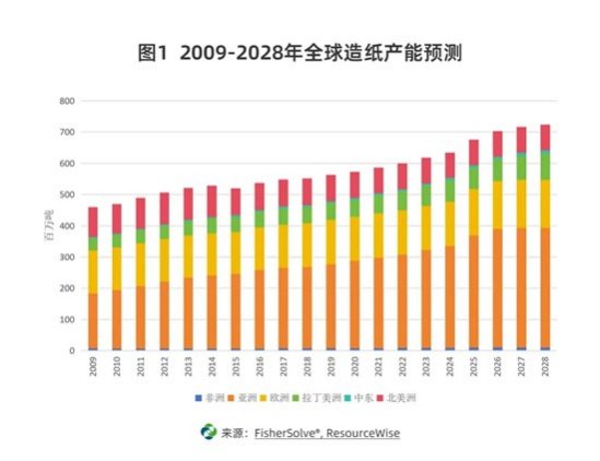 2009-2028年,全球造纸行业保持稳健增长态势,年复合增长率达2.3%,总产能预计从2009年的4.6亿吨提升至2028年的7.3亿吨。但从区域维度看,增长呈现显著不均衡性,不同区域的产能规模与增速差异明显。